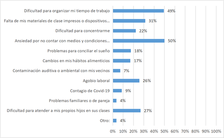 En torno a las situaciones experimentadas durante la pandemia, se distinguen principalmente dos problemáticas que repercuten en el estado emocional de los docentes. La primera de ellas se refiere a la ansiedad que sienten los profesores por no contar con medios y condiciones adecuadas para el atendimiento de educación a distancia, ya que 50% reporta dicha situación. Esto se vincula en gran medida con situaciones relacionadas con la falta de acceso a internet y dispositivos tecnológicos en los hogares, tanto de los docentes como en alumnos de escuelas multigrado dentro de territorios rurales.