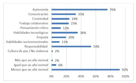 Sobre las diversas habilidades presentes en los procesos de aprendizaje de los alumnos durante el atendimiento de clases a distancia, los profesores perciben principalmente el desarrollo de “Autonomía” (76%) y “Responsabilidad” (54%) (Figura 3). Enríquez y Hernández, (2021, p.3) consideran que el año 2020 ha mostrado la necesidad y urgencia por fomentar habilidades que permita a los estudiantes ser autogestores y autorregulados, incluyendo además competencias para planear sus actividades de aprendizaje y autoevaluarse.