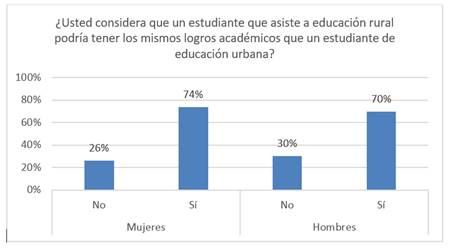 En consideración a la percepción que tienen los docentes sobre los logros de la educación rural en comparación con la educación urbana durante la pandemia, 28% de estos reporta que los alumnos no alcanzarán a obtener los mismos logros académicos que estudiantes urbanos. Sin embargo, algo importante por resaltar es que 72% de los profesores mencionan que los estudiantes rurales sí pueden obtener los mismos avances académicos que los urbanos. Lo anterior se manifiesta con pequeñas diferencias entre el grupo de hombres y mujeres, es decir, las docentes representan un mayor porcentaje en torno a la consideración de la obtención de mismos resultados en los alumnos (74%) en comparación con los hombres que también lo creen de manera afirmativa (70%) (Figura 4).