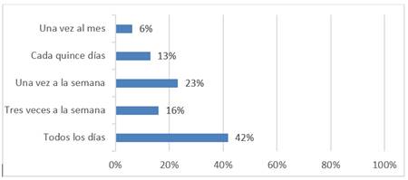 En torno a las acciones de valor comunitario, se establece como un primer aspecto la comunicación de los docentes con estudiantes, padres de familia o tutores. A partir de ello, se identifica que 81% de los profesores mantuvieron comunicación directa por lo menos semanalmente con los alumnos o tutores de estos. En consideración a ello, se reporta que 42% de los maestros se comunica de forma diaria, 23% una vez a la semana, 16% tres veces por semana, 13% cada quince días, y sólo 6% una vez al mes. (Figura 5)