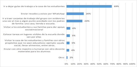 Otras acciones específicas emprendidas por los docentes es la entrega de guías de trabajo en casa de los estudiantes, el envío de recados y/o avisos por WhatsApp, así como el otorgamiento y recabo de carpetas de trabajo con evidencias de las actividades realizadas por los estudiantes, en puntos de encuentro acordados con los familiares. A partir de ello, la mayoría de los docentes (69%) proporciona guías de trabajo en casa de los alumnos, es decir, una comunicación presencial derivado en gran medida de la escasez de conectividad y falta de recursos para el atendimiento de la educación a distancia en dichos contextos escolares y sociales (Figura 6.). MEJOREDU, (2020) reconoce la creatividad de los docentes en torno la implementación de estrategias educativas durante la pandemia y a partir de ello plantea que muchos docentes asumen el reto en medio de diversas limitaciones de acceso a tecnologías, y en el caso específico del contexto rural, las escuelas multigrado o de atención a población migrante, afrontan un reto aún mayor.
