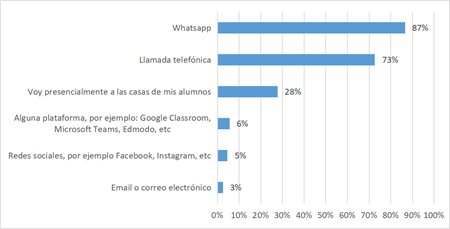 Esto refleja una constante comunicación y atendimiento por parte del docente con el objetivo de dar continuidad a su práctica profesional y propiciar la construcción de conocimientos por parte de sus estudiantes mediante el distanciamiento derivado de la pandemia. Ansessi y Acosta (2021) indican que una de las estrategias aplicadas por los docentes se aprecia desde el campo de la comunicación, en un escenario donde el acceso a internet mocil y fijo es bien escaso, los maestros se adecuaron para mantener contacto directo con sus alumnos y sus familias. Esto pone en evidencia que la responsabilidad que debieron asumir los docentes va más allá de cómo conectarse con los hogares.