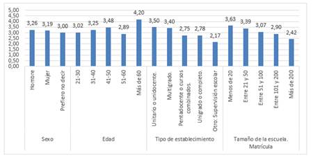 En consideración a esto, y con base en la categoría relacionada a los docentes, se percibe un mayor involucramiento por parte del grupo de hombres, así como docentes con una edad aproximada de más de 60 años. En torno a la categoría escolar y con base al tipo de establecimiento, las escuelas unitarias o unidocentes son quienes representan una mayor relación comunitaria, a su vez, respecto al tamaño de matrícula, las escuelas con menos de 20 alumnos también establecen un mayor vínculo con el contexto rural de los alumnos y sus familias. (Figura 8)