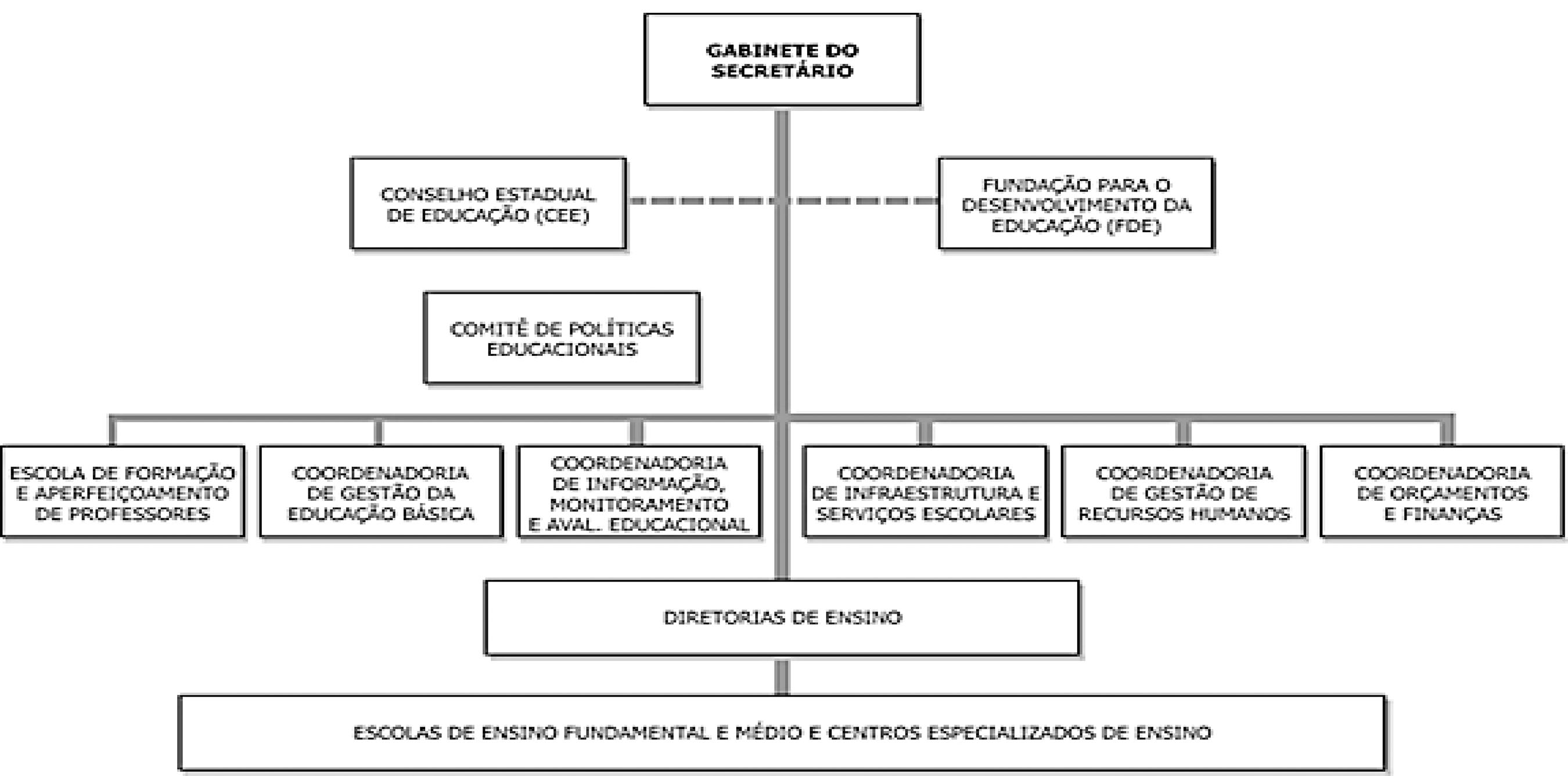 Nessa perspectiva, o governo de Geraldo Alckmin (2003-2006; 2007-2010; 2011-2014; 2015-2018) reestruturou a Secretaria da Educação do Estado de São Paulo, de modo que os departamentos se comunicassem hierarquicamente. O intuito era instituir uma rede de comandos na qual os últimos a serem atendidos, diante de suas necessidades, eram os estudantes, como se vê na figura a seguir.