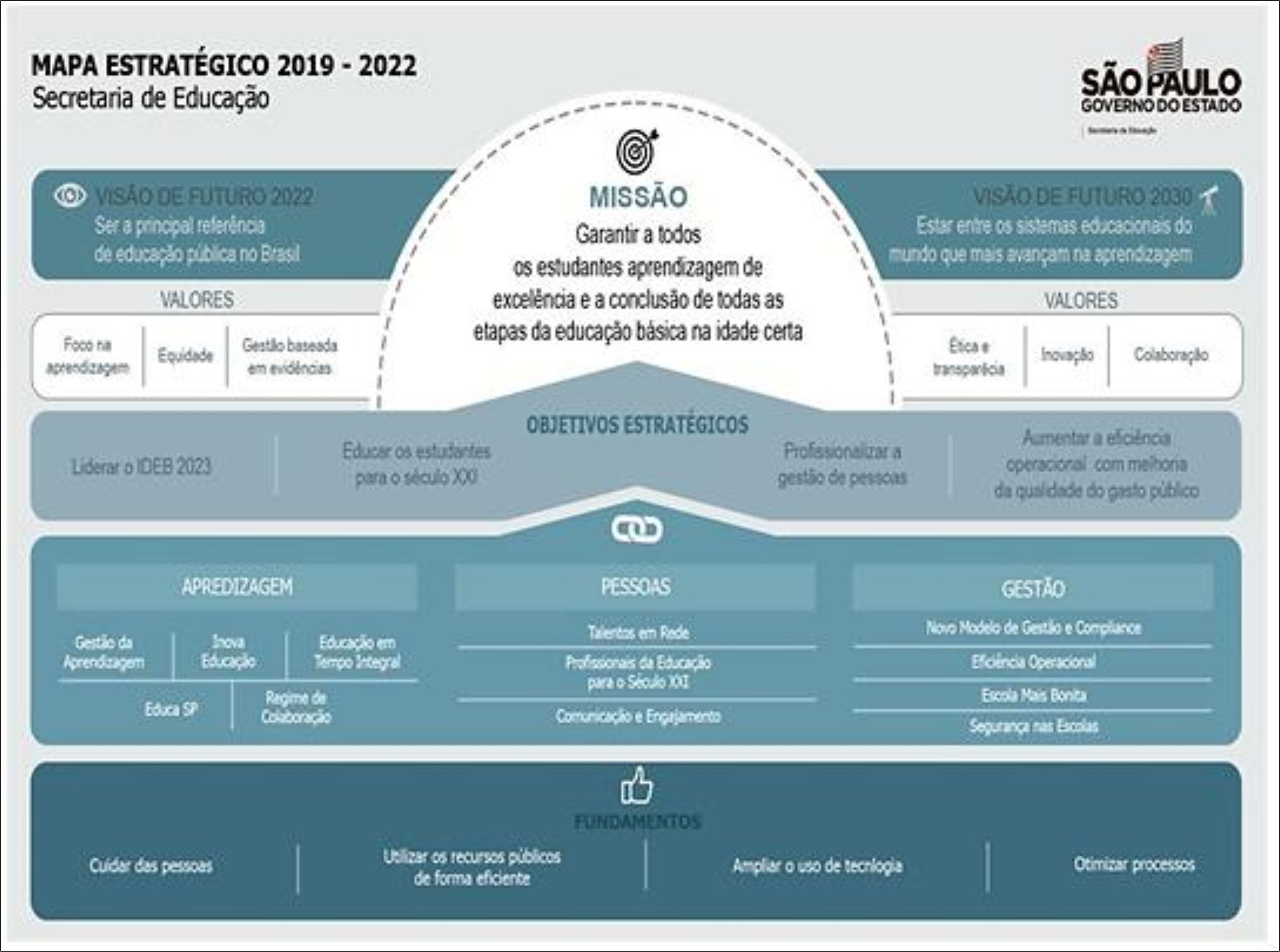 Em seu plano estratégico, o governo de João Dória objetivou superar os desafios que a educação pública vinha enfrentando, entre eles a evasão escolar e o baixo desempenho estudantil. Nesse sentido, propôs-se a oferta de uma educação de qualidade aos paulistas. Mais especificamente, “a Secretaria apresentou então o plano estratégico 2019-2022, do qual constavam a missão, a visão, os valores e as diretrizes que servirão de guia para os trabalhos da rede de ensino” (SÃO PAULO, 2019).