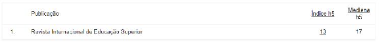 O índice h5 é o indexador h dos artigos publicados nos últimos cinco anos. Trata- se do maior número h de uma publicação, em que há artigos publicados de 2017 a 2021 tenham sido citados no mínimo h vezes cada.
