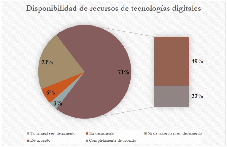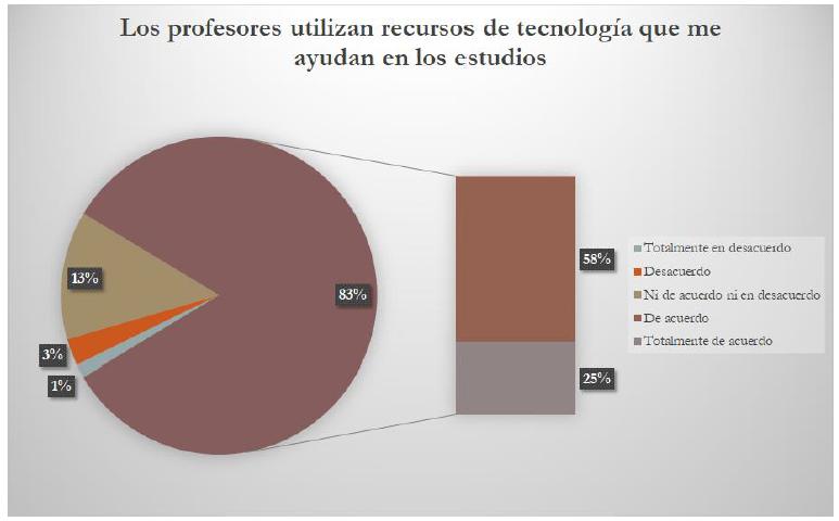 Cuando hablamos del uso de la tecnología por los profesores en el momento actual tenemos un 83% de respuesta positiva al fomento de la permanencia y contrastada con la disponibilidad donde el 71% están de acuerdo o muy o totalmente de acuerdo que les ayuda en sus estudios, se puede inferir la relevancia que tiene para los estudiantes en el proceso educativo.