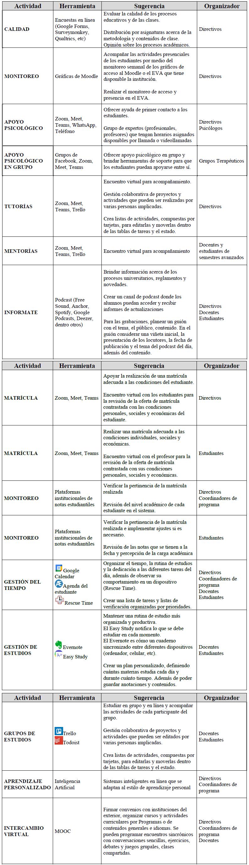 En este sentido, proponemos cada una de estas acciones o actividades como mecanismos de apoyo, en primer plano, a los estudiantes, pero pueden auxiliar a todos los actores del sistema educativo en sus actividades administrativas o académicas. En resumen, el sentido del uso de las tecnologías digitales para mediar los mecanismos de apoyo se presenta en la Figura 4.