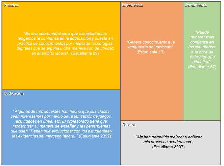 Las categorías a priori son Gestión, Prácticas y Dedicación, y las emergentes son Sentimientos y Experiencias. Las categorías con más presencia en los comentarios de los estudiantes participantes de investigación fueron: Prácticas y Experiencias. En el Diagrama 1 presentamos la proporción de respuestas por categorías, además de un ejemplo de las respuestas de los sujetos.