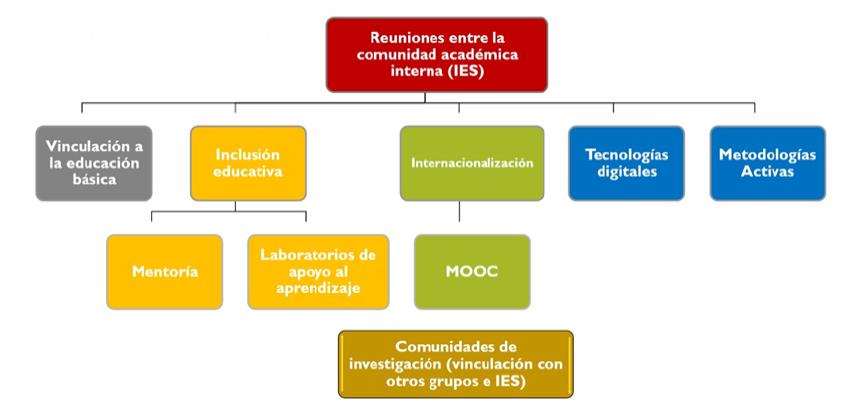 Este modelo, presentado en la Figura 2, está estructurado para ser trabajado en la educación superior, presenta dos extremos que desarrollan las actividades, uno son las reuniones que se realizan entre la comunidad académica interna (IES) y el otro aquellas que realizan las comunidades de investigación. Estas variables, están así dispuestas para abarcar diferentes contextos, las reuniones internas se piensan y aportan en el contexto local considerando las variables internas, para después, de manera conjunta con las comunidades de investigación conocer las acciones que se apliquen a un nivel más global que puedan servir para adaptar métricas y acciones en la institución.