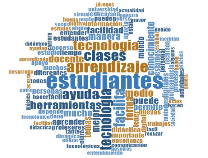 La nube de palabras presentada en la Figura 3, donde el tamaño de cada palabra indica su frecuencia, admitida como la relevancia de un tema determinado, permite visualizar los núcleos de significados que le dan los estudiantes a la importancia de las tecnologías digitales para los procesos académicos y a su permanencia en la universidad. Así, se evidencia el énfasis en las palabras Aprendizaje, Clases, Ayuda y Facilita, además de las palabras Tecnología y Estudiantes, lo que corrobora las inferencias que se hacen del análisis y permite conocer las voces de los estudiantes cuando hablan sobre el uso de tecnologías.