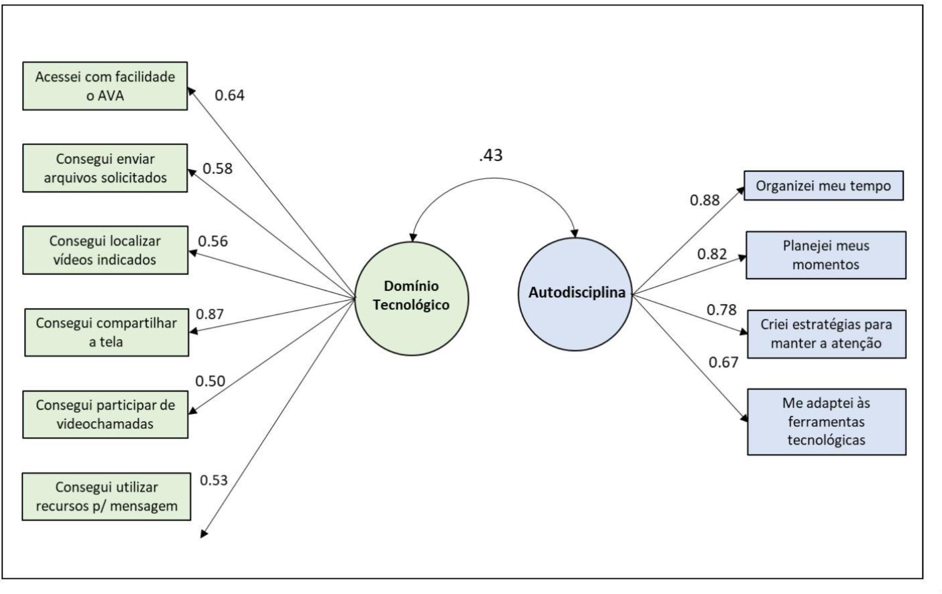 A correlação entre as dimensões Autodisciplina e Domínio Tecnológico foi de 0,43 e suas cargas fatoriais acima de 0,50 para todos os itens (Figura 1). A fidedignidade da medida foi mensurada pelo Alpha de Cronbach e pelo Ômega McDonald, cujos valores foram idênticos (0,80) para a dimensão Autodisciplina e para a dimensão Domínio Tecnológico (0,87). Assim, a versão final da escala apresenta estrutura bifatorial e 10 itens.