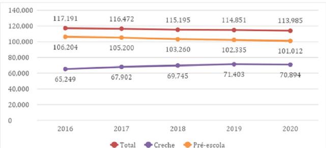 Dados do Censo Escolar da EB de 2020 indicam, ainda, que, no período de 2016 a 2019, houve um crescimento de 8,4% nas matrículas da EI. Apesar disso, em 2020, observa-se queda de 1,6% em relação a 2019. A principal razão do decréscimo no número de matrículas apontada pelo relatório foi a redução de 7,1% na rede privada, sendo 6,9% na creche e de 7,2% na pré-escola, causada, provavelmente, pela pandemia, que fez com que muitas famílias deixassem de matricular seus filhos na rede privada. Tal argumento se robustece na medida em que se verifica um crescimento de 0,7% de matrículas na rede pública, impulsionada, principalmente, pelo aumento de matrículas na pré-escola.