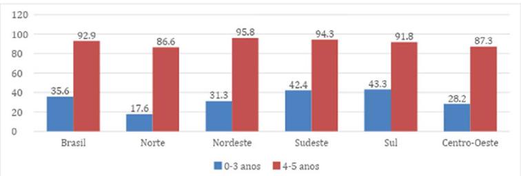 De acordo com a Pnad Contínua de 2019, a taxa de escolarização ou de frequência entre as crianças de 0 a 3 anos de idade foi de 35,6%, ao passo que na pré-escola alcançamos uma cobertura de 92,9% de crianças de 4 a 5 anos frequentando estabelecimentos que ofertam a EI na etapa de pré-escola (ver Gráfico 2 que segue):