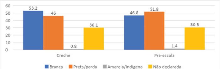 Quando a variável cor/raça é observada, em convergência com o que apontava Rosemberg (1997), o número de crianças brancas na creche é superior (53,2%) ao de crianças pretas/pardas (46,0%), conforme podemos visualizar no Gráfico 3.