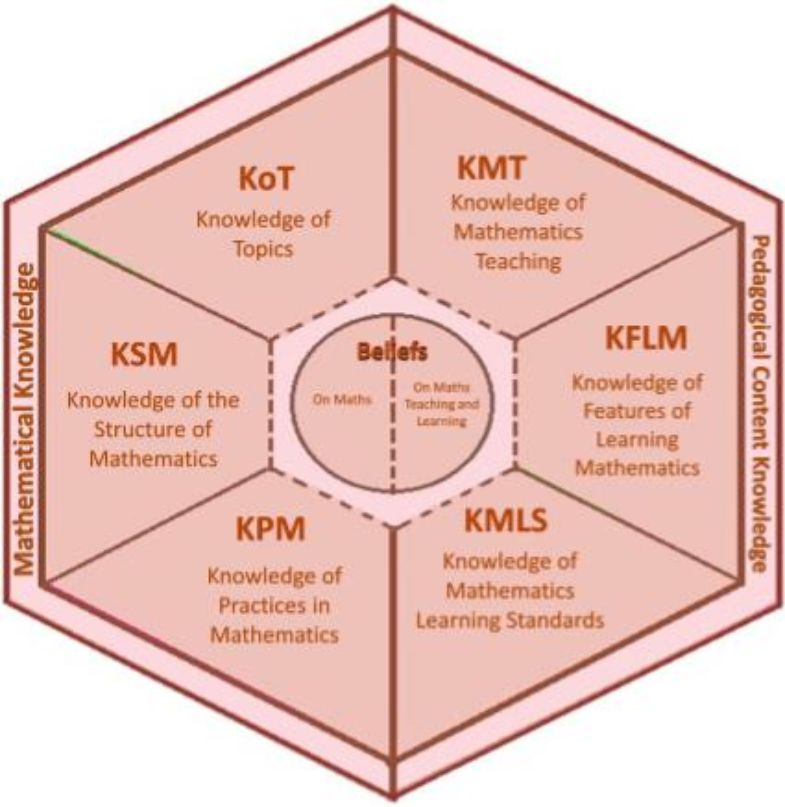 O conhecimento matemático (MK) refere-se ao conhecimento do professor sobre as características e elementos da Matemática. Este domínio é composto pelos subdomínios: conhecimento dos tópicos (KOT), conhecimento da estrutura matemática (KSM) e o conhecimento da prática matemática (KPM).