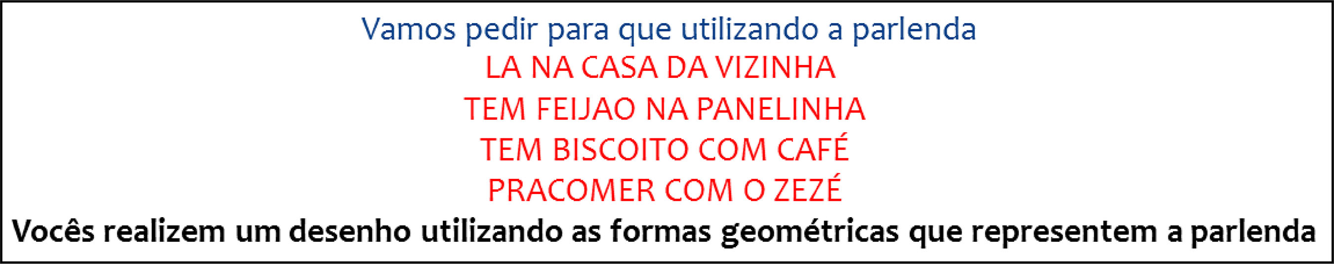 | Parlenda 1 | Quebra-cabeça sobre a parlenda Colagem de figuras geométricas para a representação do cenário da parlenda Percepção das palavras que tem o mesmo som |