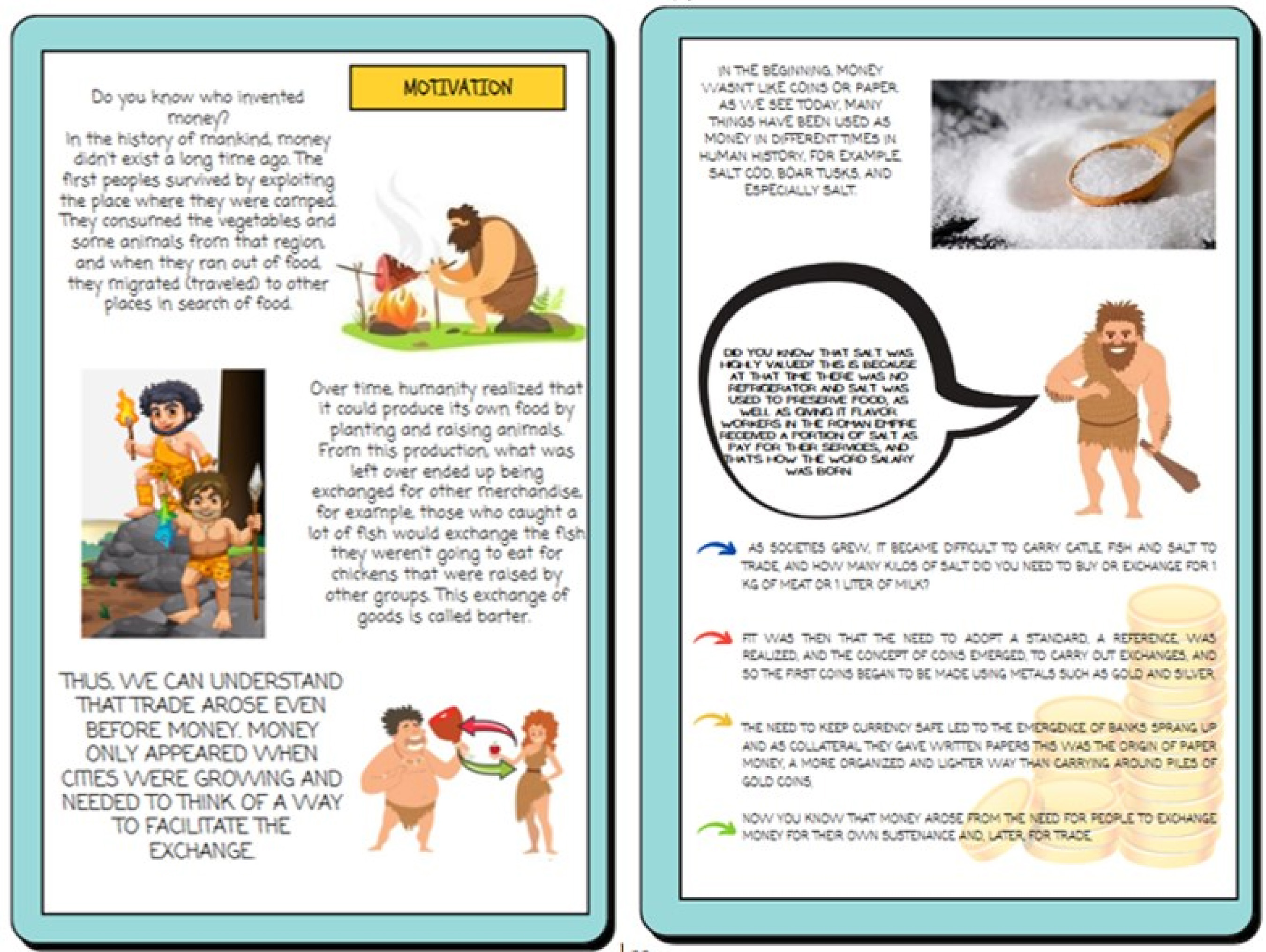 The first chapter aims to reflect on the origin of money and its use in history. The activity, entitled Where does the money come from?, is scheduled to take 50 minutes and involves dividing the students into groups so that each one is responsible for different consumer items. The groups have to barter with each other, simulating a barter operation, without the teacher’s interference, this being the specific moment for the end of the activity, as illustrated in Figure 1.