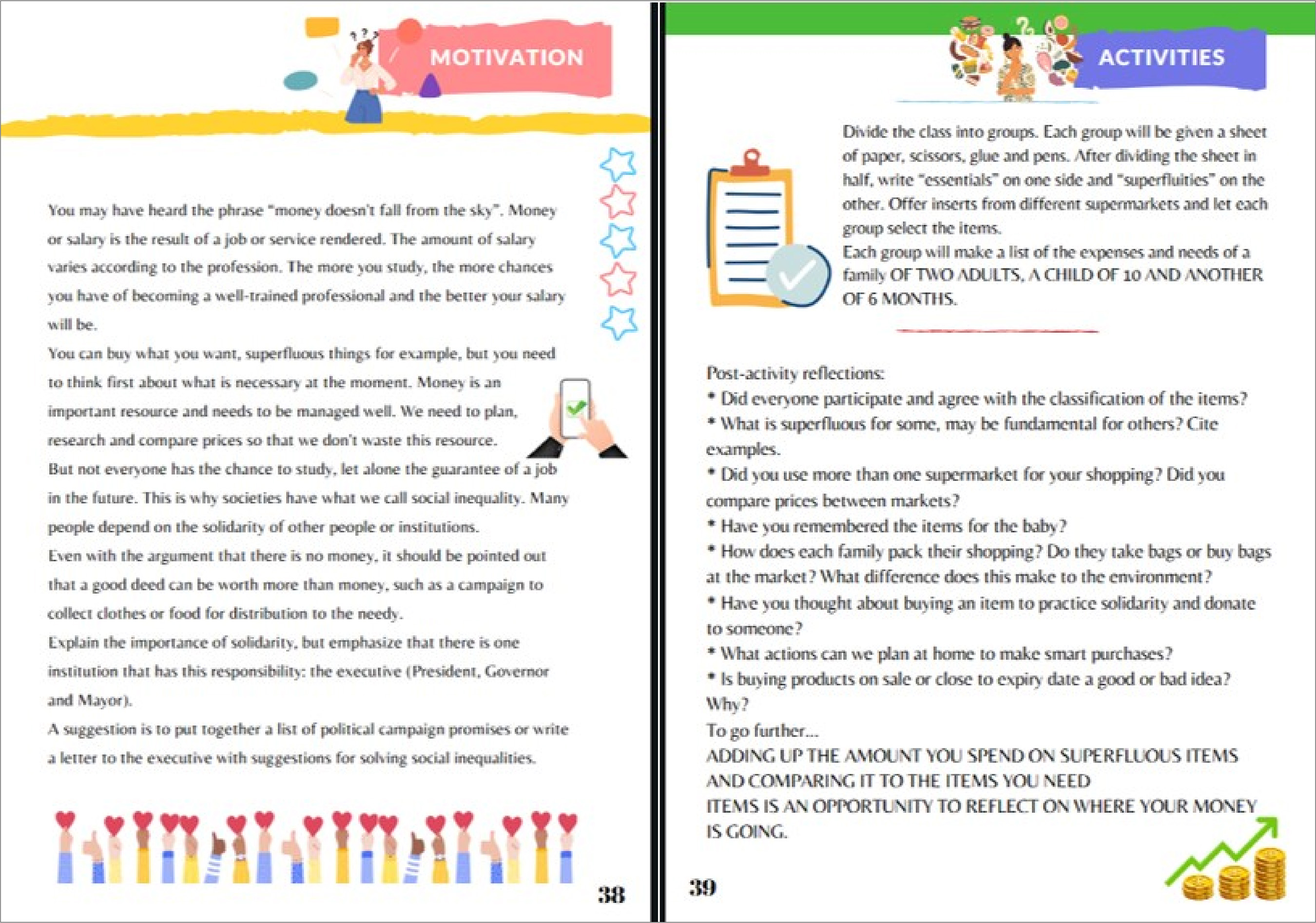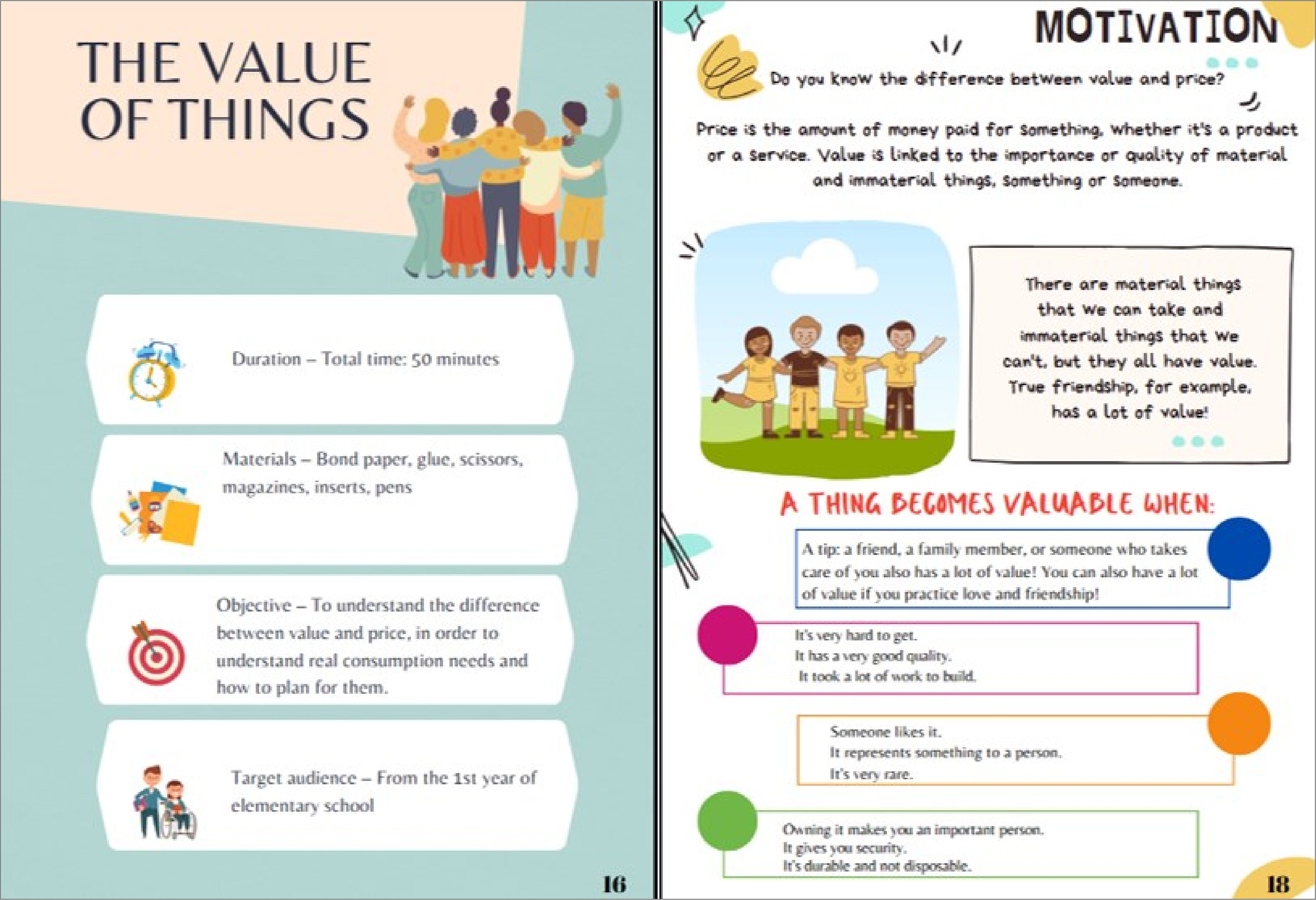 [...] I was delighted because it addresses themes that are very dear to Financial Education, but are little (or not at all) addressed in materials that circulate around, such as: solidarity, ethics, desires versus needs, essential versus superfluous items, environmental preservation, caring for the collective, price and value.