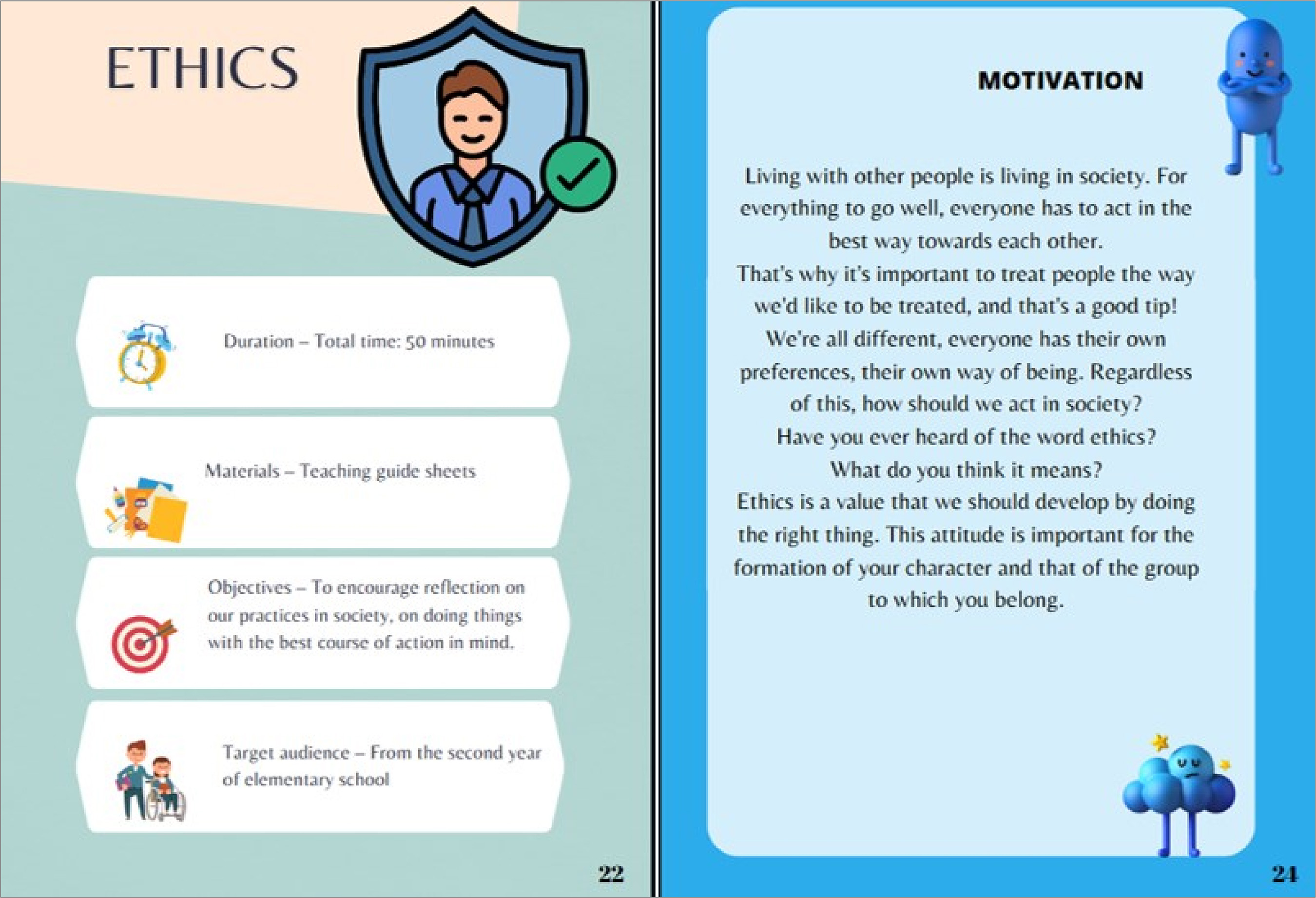 After some concepts have been presented to the groups, three situations are discussed in which there is a conflict with ethics, represented by actions in children’s daily lives, such as finding an object without the owner’s name on it; receiving too much change at the store; and creating advantages by receiving duplicate school supplies. As a form of institutionalization, the Guide suggests that the teacher raises questions in relation to personal narratives involving ethical and non-ethical attitudes.