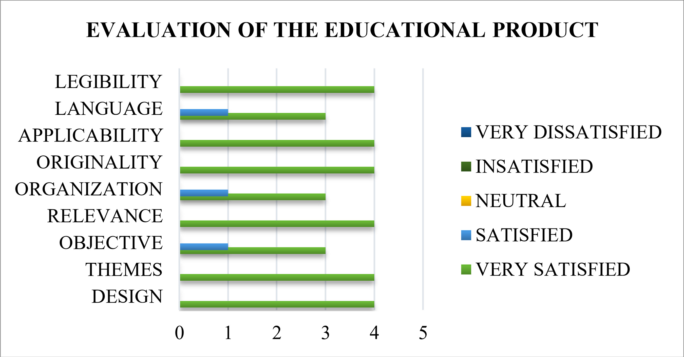 The evaluation of the Educational Product received four responses, which graded the optional questions between very satisfied and satisfied, as shown in Graph 1.