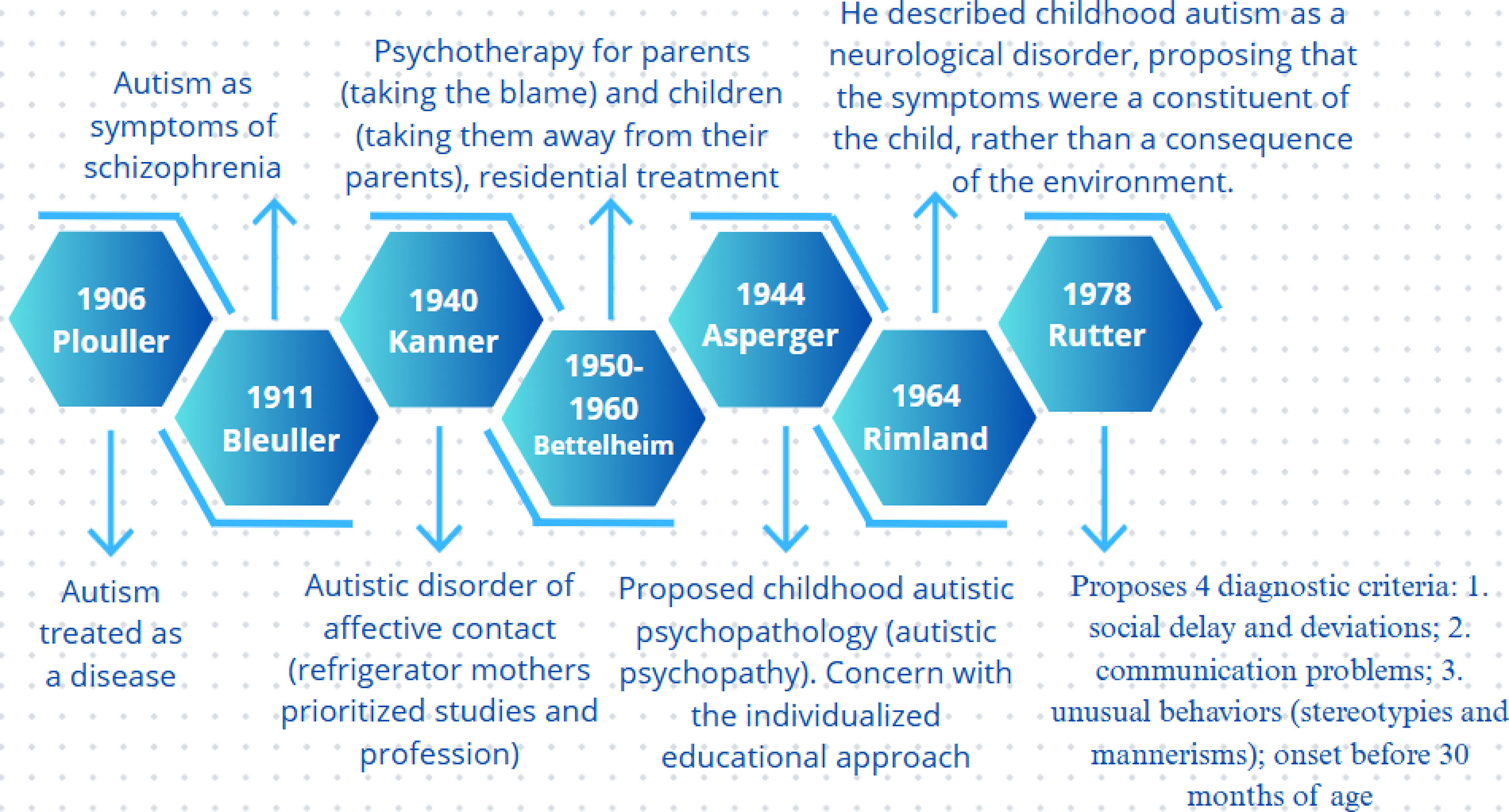 From the demented to the schizophrenic, from the schizophrenic to the victims of their parents' indifference, until the 1960s, these people were considered threats to the so-called normal people — they should be separated from society — or victims of their parents' lack of affection — thrown into mental hospitals or boarding schools that would keep them away from their family life. In any case, the prevailing logic during this period was to isolate people with ASD, excluding them physically and symbolically. For decades, “their rights [were] relegated, and they were sent, as children, to mental hospitals in search of containment of their deviant behaviors, being subjected, for this purpose, to torture and degrading treatments” (Carvalho, 2023, p. 268).
