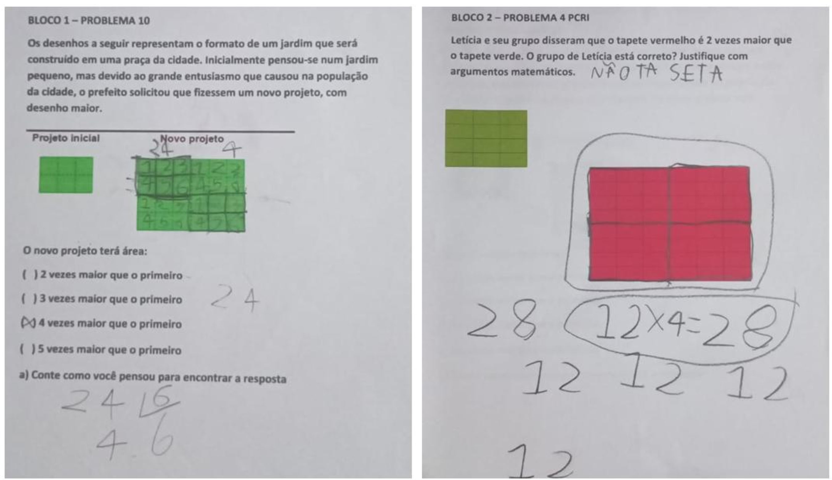 It is also observed that the child has a cognitive style focused on details. He numbers the squares, realizing that it is necessary to form sets of six of them. This numbering is essential for him to realize that the larger rectangle contains four sets of six squares, a detail that was not noticed by most of the students and that led them to tend to choose the first alternative, motivated by the comparison of the height and width measurements of the rectangles — in which the larger one is twice the size of the smaller one.
