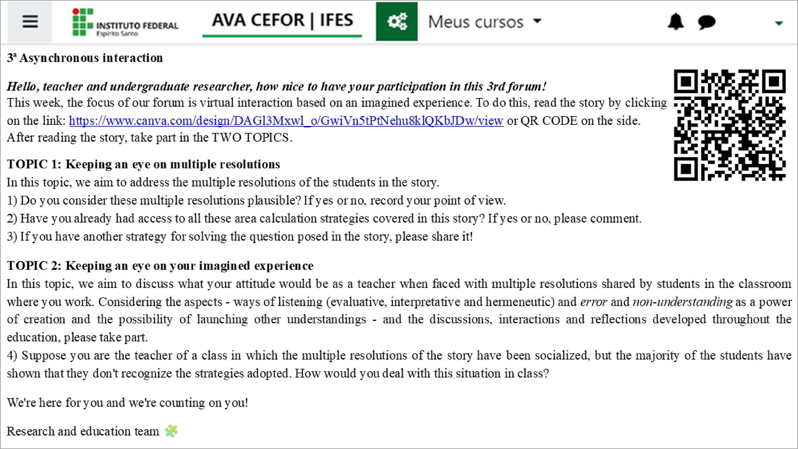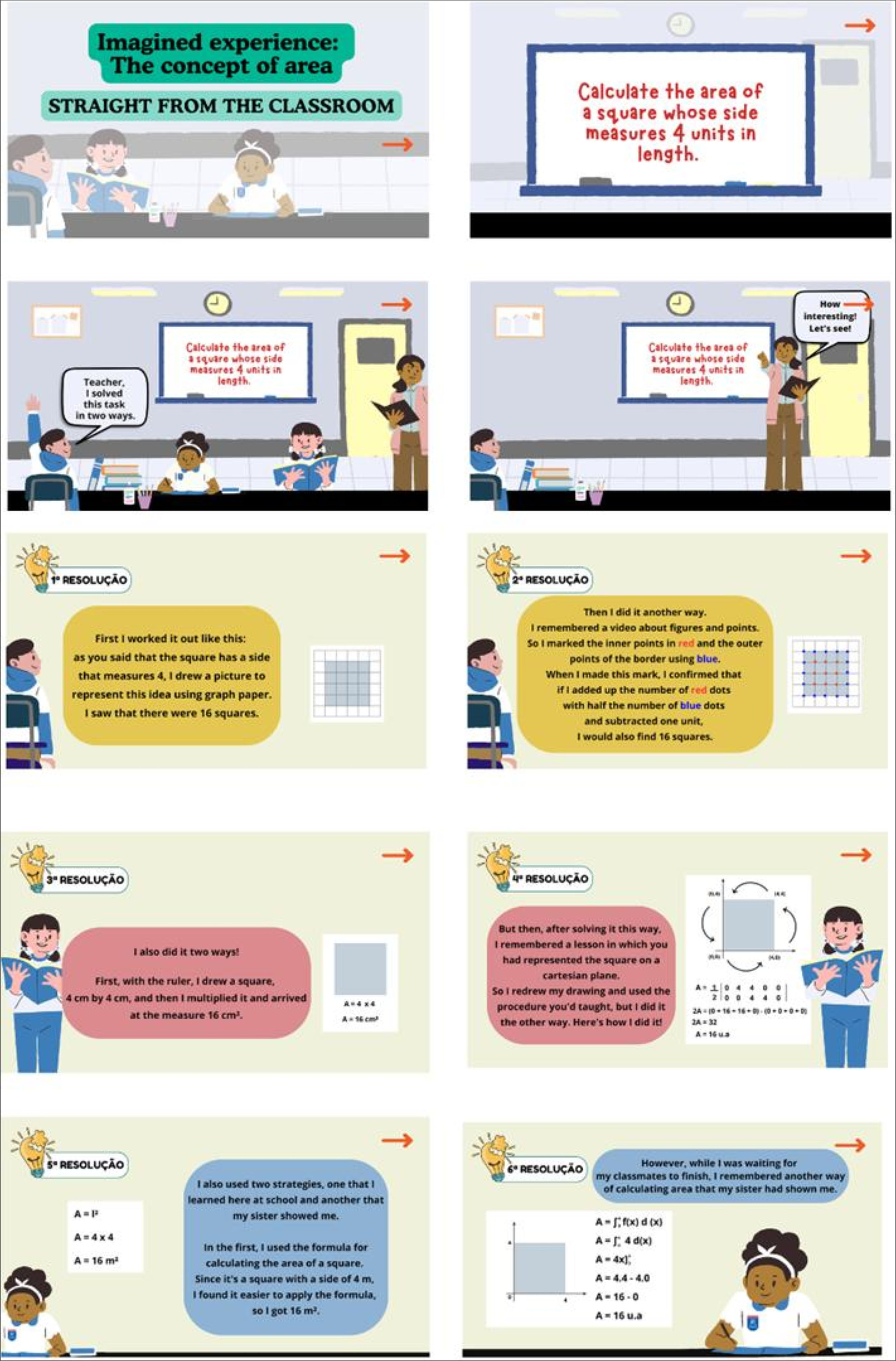 This section presents and analyzes posts made by teachers and trainees, which include their points of view in relation to the multiple resolutions of the story, the production of other resolutions and the description of how the participants and teachers would deal with the multiple resolutions in their teaching practices. Figure 1 shows the direction of the virtual forum and Figure 2 shows the story Imagined experience: the concept of area straight from the classroom.