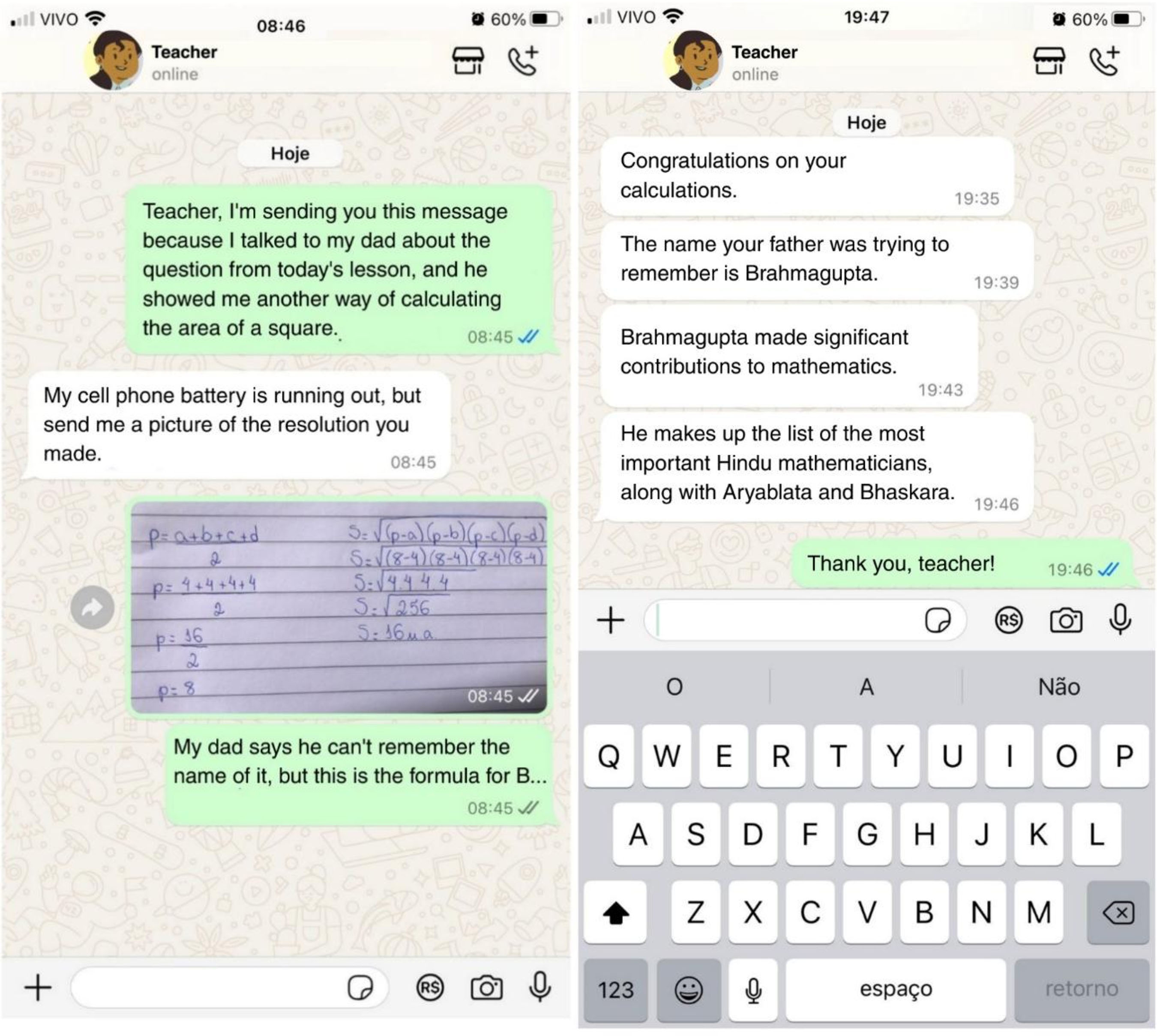Another resolution was sent in by Participant LR, a strategy known as the Brahmagupta Formula. In presenting her contribution, this participant continued the story. To do this, she produced an imagined experience between the teacher and a student via WhatsApp, as illustrated in Figure 3.