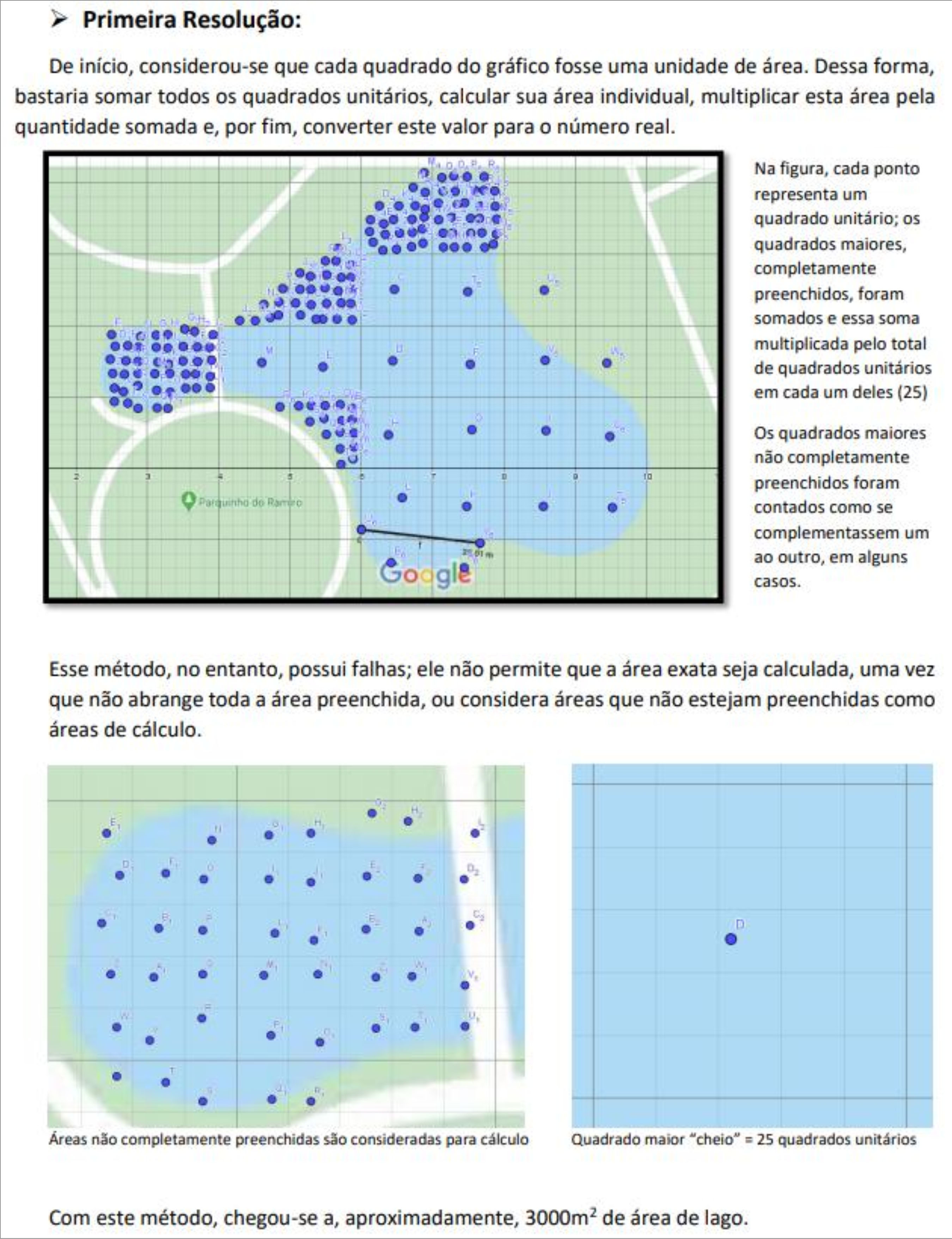 O valor encontrado pelo grupo de 3243 m² foi maior que o valor esperado de 2900 m², sendo que essa situação é decorrente, principalmente, da maneira anterior como os pontos de medição foram distribuídos em torno do lago. Como se percebe na imagem anterior (direita), na Figura 9, o GM1 começou a demarcação dos pontos ainda na área verde. Portanto, esse adicional de área acabou influenciando no valor de área esperada para o lago; no entanto o importante é o detalhamento, no relatório, das informações que levaram ao erro. Nele, o grupo explicou a razão das inconsistências da área encontrada em relação à esperada (observada na plenária)