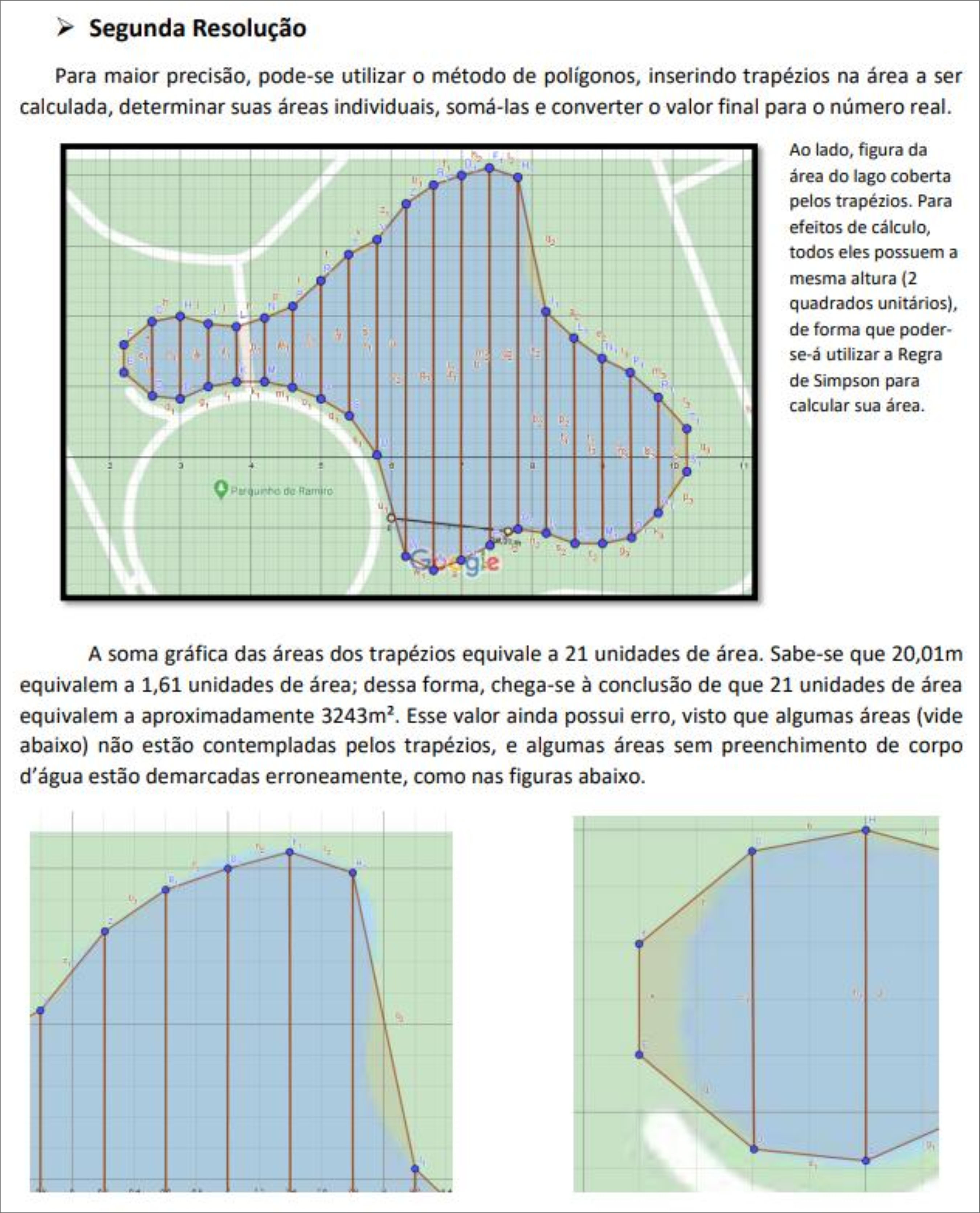 (E15 falando): Eu tenho uma dúvida com relação ao problema 3. Só podemos usar trapézios para preencher a região do lago? Eu não poderia fazer alguns quadrados grandes e só contorná-los com trapézios para agilizar o processo?