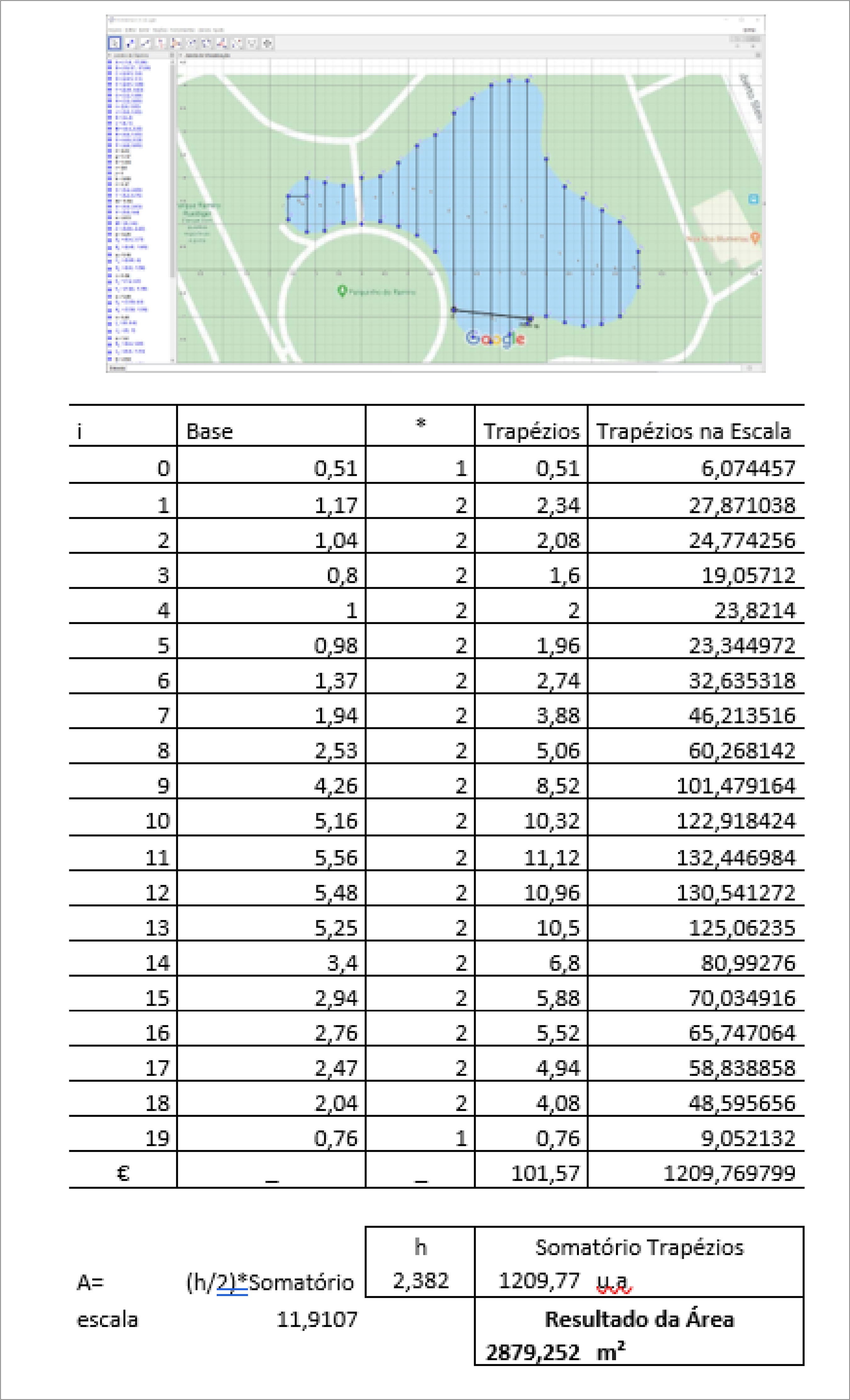 (E27 falando): Dividimos o lago em 19 segmentos de trapézios para poder calcular a área mais aproximada possível do lago do Parque Ramiro Ruediger. Então, com base na equação ATa=h2[b1+2(B1+B2+B3)++Bn1+bn] , construímos uma tabela para melhor representação dos resultados.