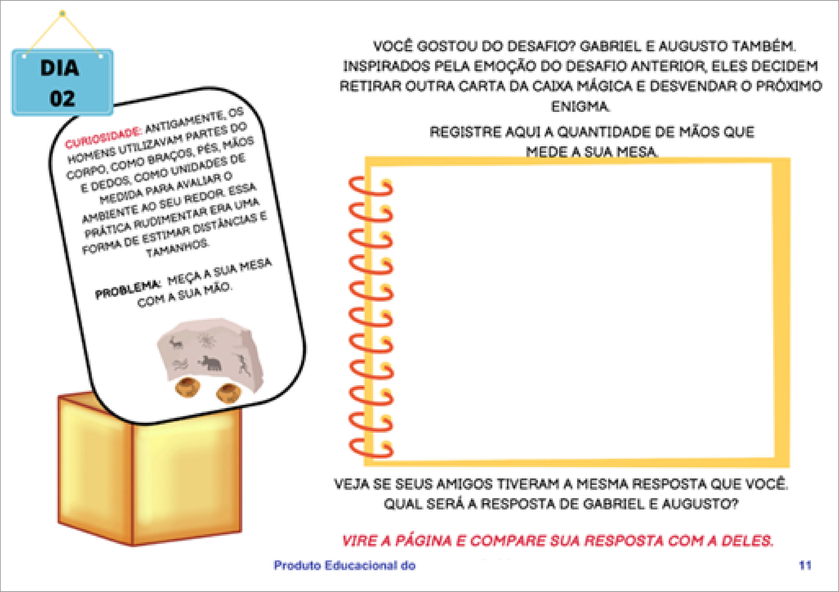 Na trama, os personagens continham uma caixa contendo desafios matemáticos a serem resolvidos. Como forma de levar as crianças a interagir com eles, foram apresentados os desafios em fichas, colocadas dentro de envelopes individuais e fixados nas caixas desenhadas nas páginas do livro. Assim, em cada prática, quando um personagem tirava uma ficha da caixa, uma das crianças era convidada a ir até o livro e retirar o envelope com a questão a ser lida.