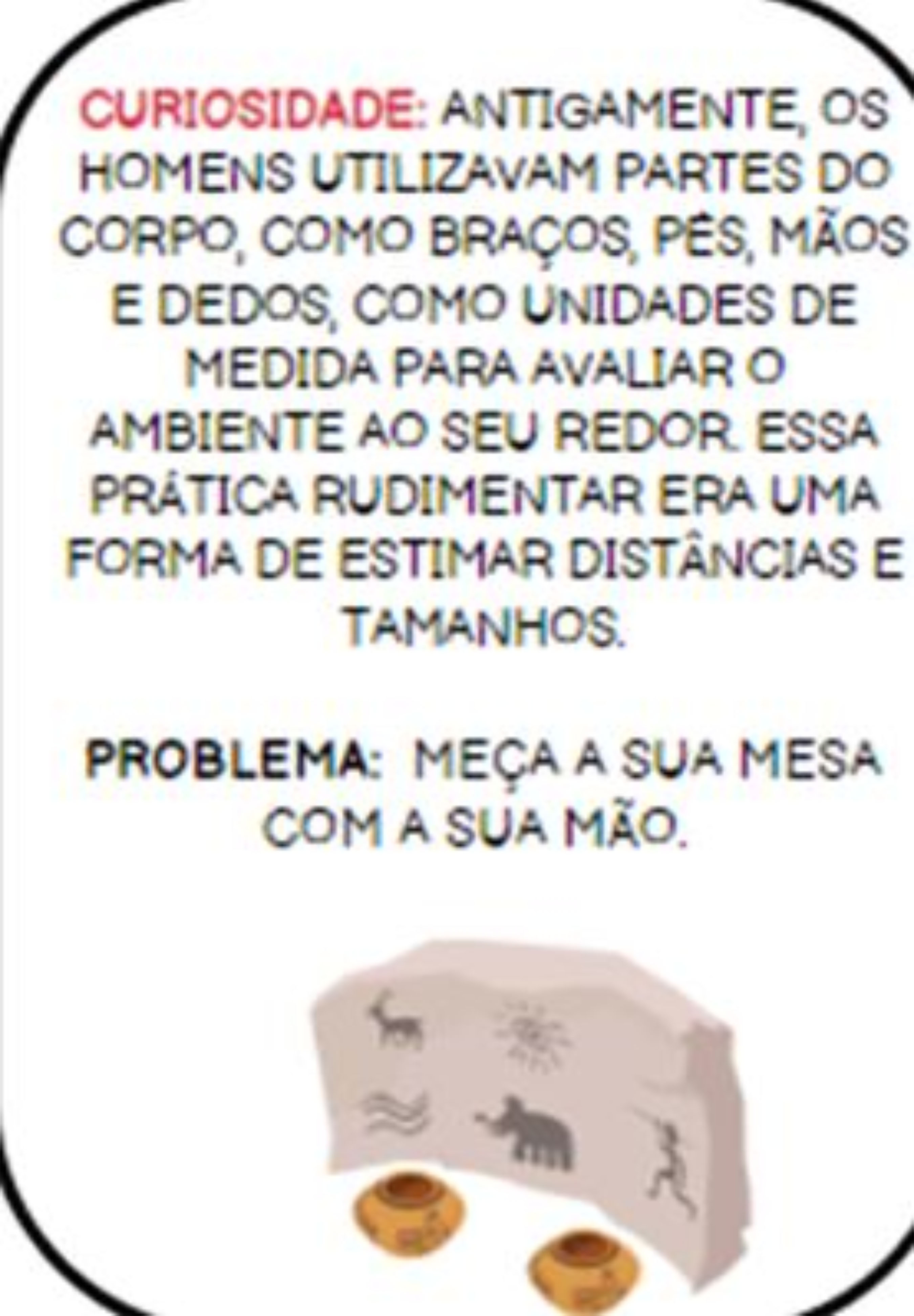 Após essa nova medição, leu-se a frase no quadro que o personagem da história segurava. As crianças começaram a comparar seus resultados com os dos colegas, e a maioria obteve o mesmo valor, com apenas cinco apresentando medidas diferentes.