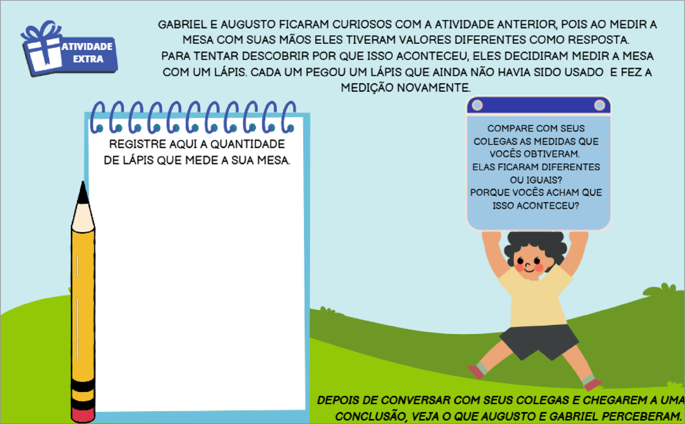 Após as discussões, a página do livro foi novamente virada, e todos juntos verificaram as medidas dos personagens da história. Constataram que, ao usarem o lápis como referência, eles também haviam obtido as mesmas medidas. Isso reforçou o entendimento e a confiança nas suas descobertas, mostrando que a medida de um objeto é representada por um número e que, para encontrá-la corretamente, é necessário um instrumento único de referência, permitindo a comparação de seu comprimento com o do objeto medido.