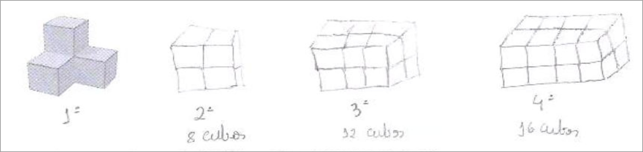 A princípio, considerou-se que essa resolução da Tarefa 1 não foi bem-sucedida. O que a estudante fez foi observar que o elemento dado possuía 4 cubos e, com base no arranjo que deu ao 1º termo, desenhou o 2º termo. A partir daí, construiu a sua sequência. No entanto, o 1º termo da sequência criada deveria ser outro (Figura 8).