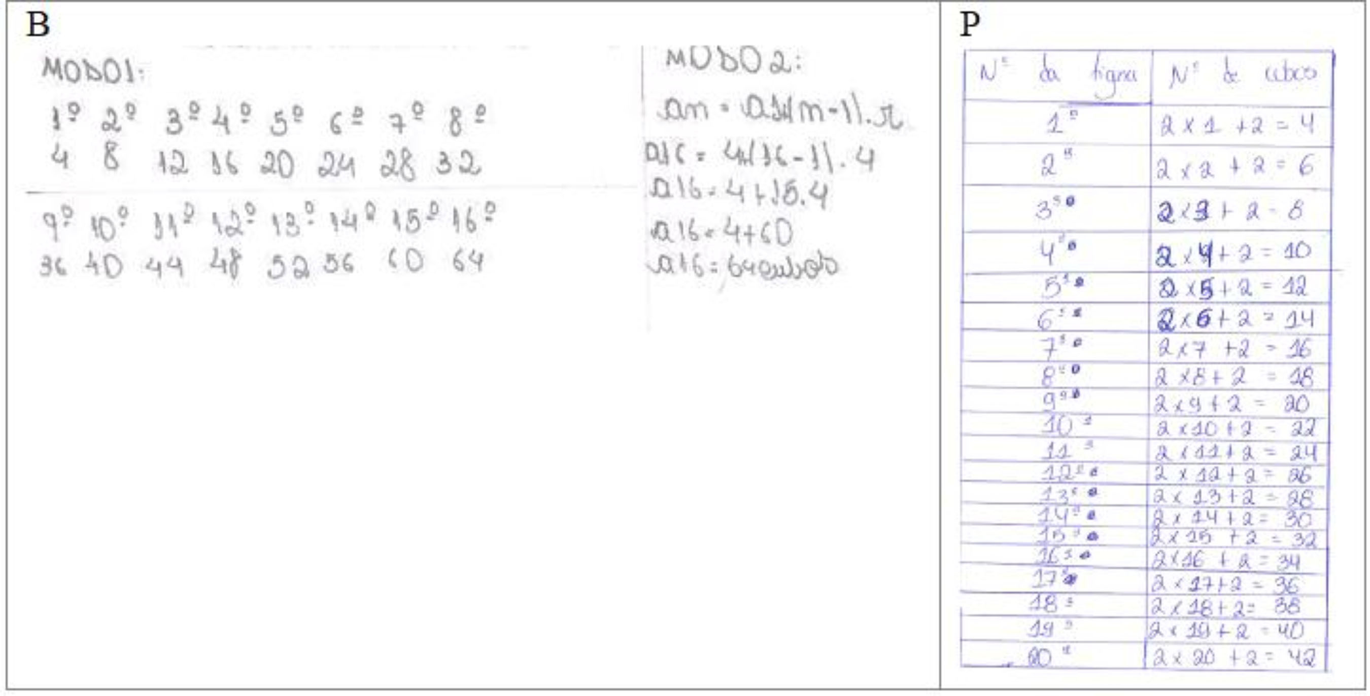 Figura 17 Resoluções analíticas (expressões algébricas B e expressões aritméticas P) e resolução visual (desenhos P)