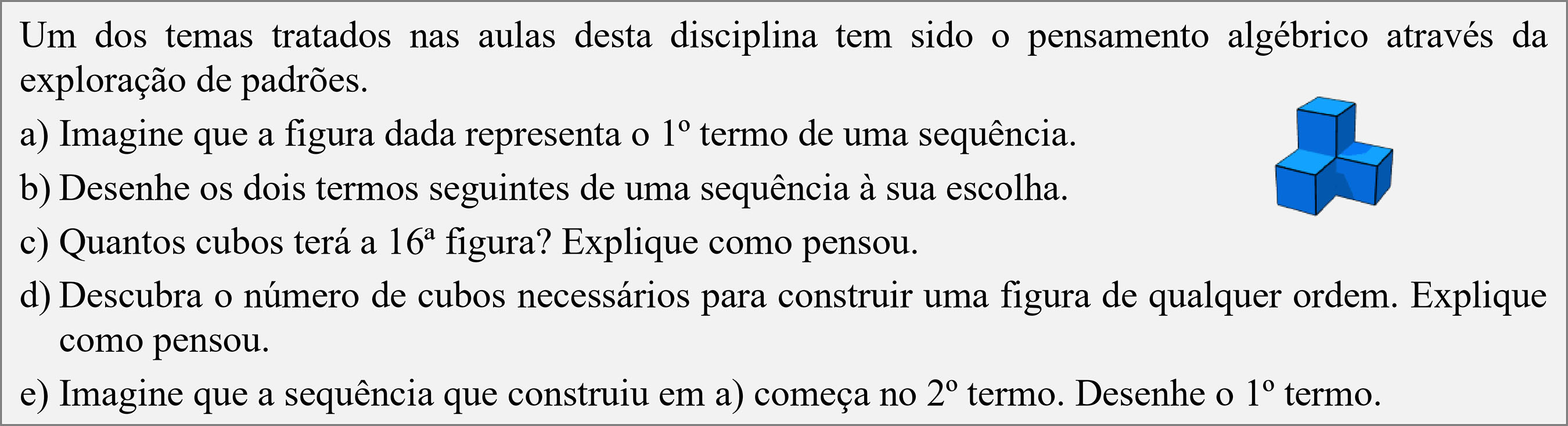 Esta sequência não pode ser considerada correta, já que não evidencia um padrão figurativo completamente definido. Contudo, as questões posteriores foram consideradas e a estudante obteve sucesso na sua resolução. Infere-se que a estudante teve dificuldade em visualizar uma construção a partir do modelo dado, mas demonstrou flexibilidade de pensamento ao apresentar uma alternativa. Ainda assim, a configuração inicialmente fornecida é crucial para a obtenção do pedido que consistia em partir de uma estrutura previamente definida. A sequência estaria correta se, em vez de fornecer a imagem do 1º termo, fizesse o seguinte pedido: Construa uma sequência figurativa com cubos, cujo primeiro termo seja formado por 4 cubos.