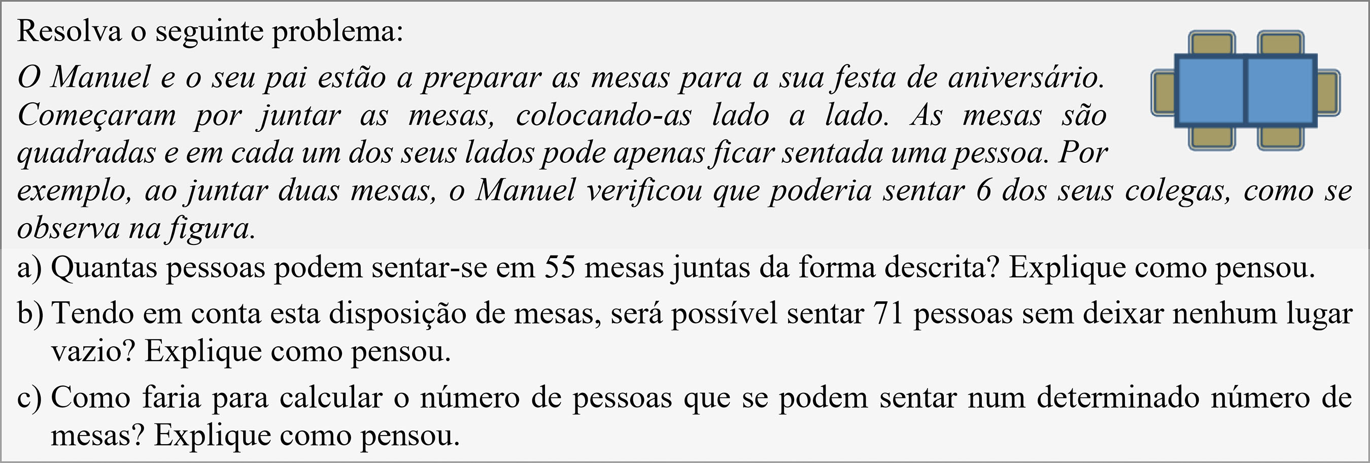 A segunda tarefa se insere no âmbito da resolução de problemas, em que a descoberta de padrão é a estratégia por excelência para a sua resolução. Essa tarefa tem o mesmo objetivo da anterior: chegar à generalização. Entretanto, a construção da sequência que permite alcançar a regra geral deve ser realizada pelos estudantes, o que a torna de nível cognitivo elevado para a maior parte deles. Os estudantes podem também chegar à generalização recorrendo a processos mais analíticos, como os conhecimentos de progressões aritméticas. Nesse caso, o processo torna-se mais simples depois de identificar o primeiro termo e a razão da progressão.