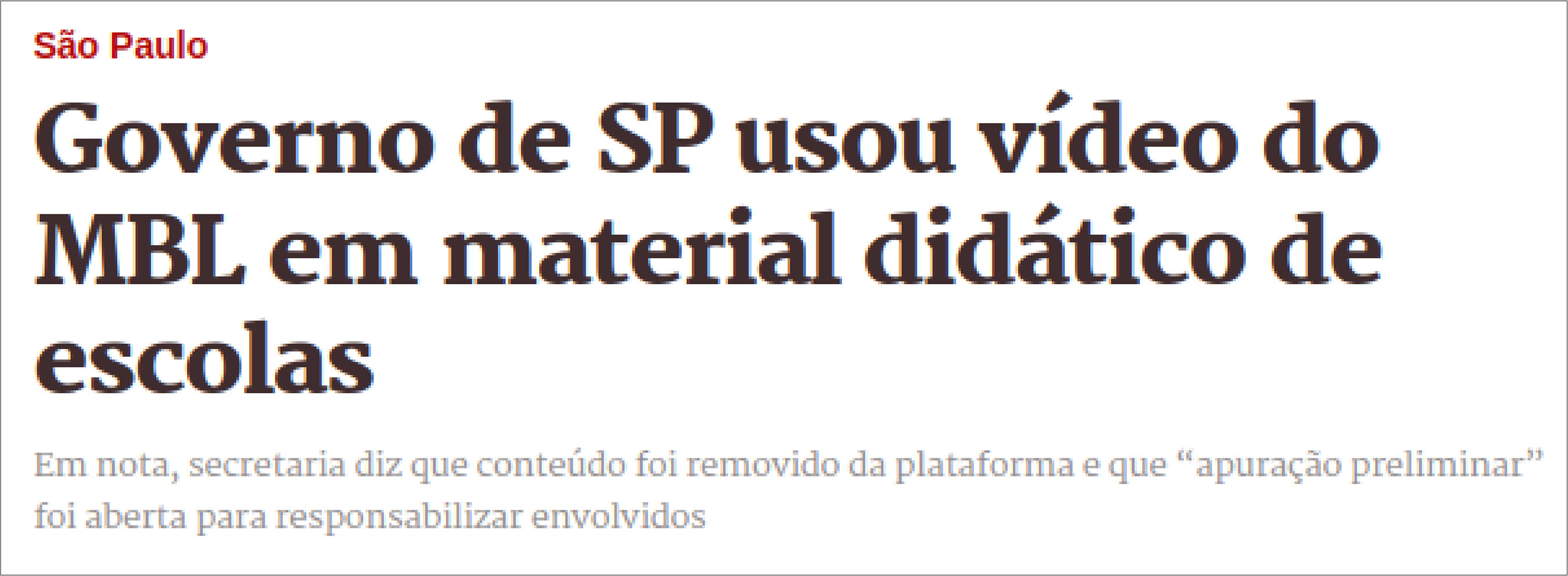 O texto de apresentação das medidas que fazem parte do Programa Sala do Futuro, lançado em março de 2023, afirma que seu principal objetivo é contribuir para a melhoria dos indicadores educacionais, assim como a frequência e a performance das estudantes. Não tardou, contudo, para que as primeiras falhas emergissem: erros conceituais graves nos conteúdos de todas as disciplinas (Figura 2), concepções equivocadas em relação ao desenvolvimento de habilidades por faixa etária e até mesmo o uso de vídeos do Movimento Brasil Livre (MBL), o mesmo patrocinador do Movimento Escola sem Partido (Figura 3). Embora, conforme evidenciam as manchetes a seguir, a gestão da Secretaria de Estado de Educação de São Paulo (Seduc) tenha buscado responsabilizar culpados e corrigir os erros e falhas mencionadas, resta, na concepção da política, o equívoco de tentar suprir as deficitárias condições de trabalho docente com a oferta de material didático digital planejado por pessoas que não necessariamente conhecem a realidade da rede estadual de ensino
