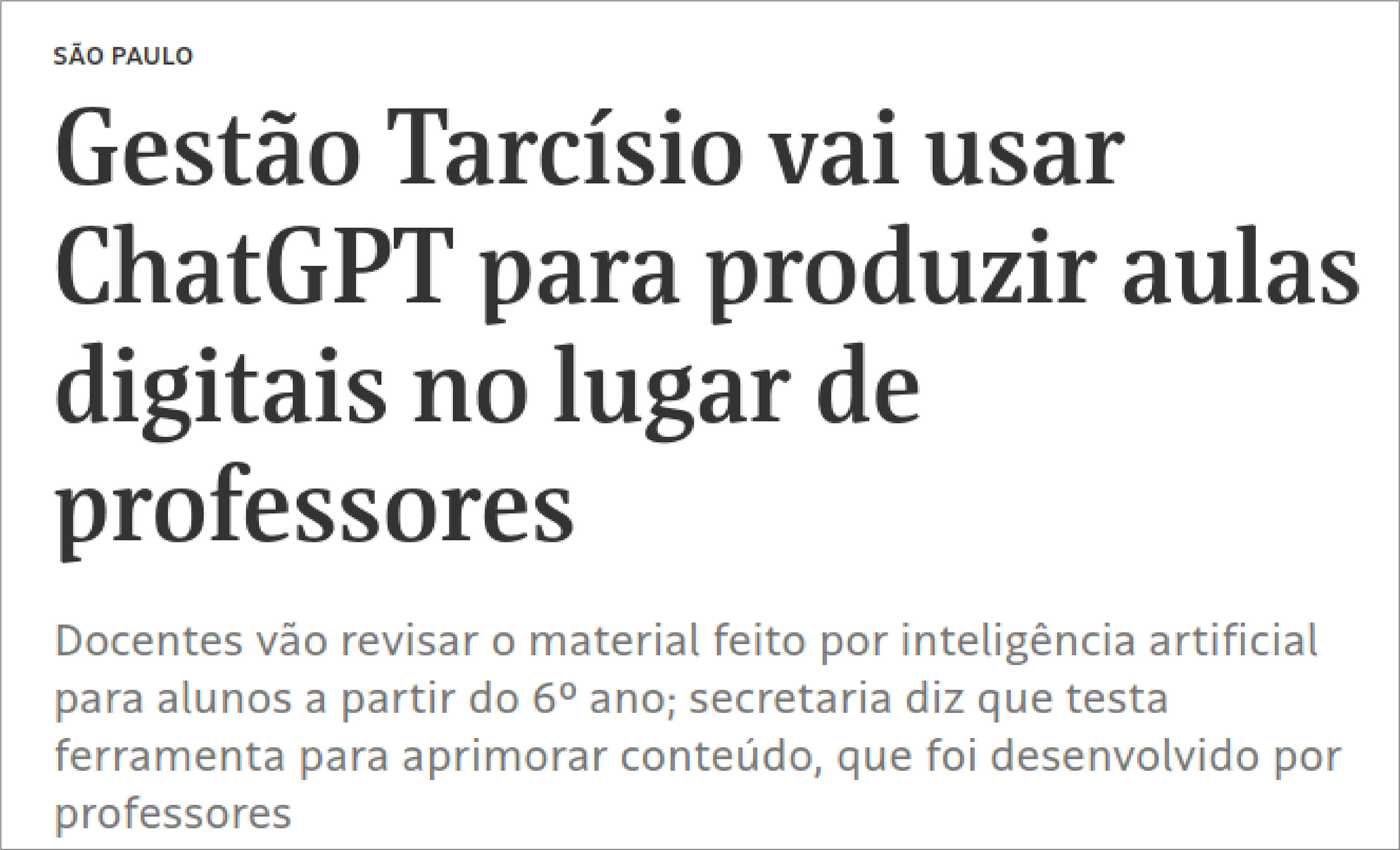 E assim, em meio a uma atmosfera que grita silenciosamente cale-se e obedeça, as professoras das escolas estaduais de São Paulo lidam com numerosas e significativas mudanças anunciadas e impostas verticalmente, sem ou com pouca consulta popular. Novas orientações educacionais são reveladas à comunidade paulistana, comumente por meio de manchetes de jornais e publicações em sites oficiais, como as que podem ser observadas nas imagens a seguir. Uso excessivo de materiais e plataformas digitais, uso de inteligência artificial para elaboração de material didático, ferramentas de avaliação do trabalho docente pautadas no tempo de uso das plataformas e no desempenho do corpo discente em provas externas são exemplos de alterações das diretrizes educacionais que interferem diretamente no cotidiano escolar e nas possibilidades de currículo vivenciadas em sala de aula.