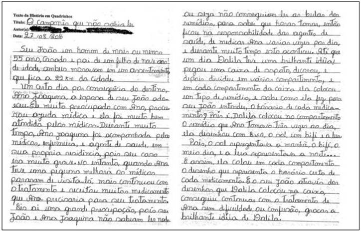 Na história da aluna C5 é possível observar a contribuição dos signos visuais para a compreensão da realidade de dois camponeses analfabetos. Como não sabiam ler e escrever, duas importantes ações linguísticas, necessitavam aprender uma linguagem que pudessem fazê-los comunicar com o mundo a sua volta e, foi com a internalização desses signos, que conseguiram efetivar esse processo. Mas, para isso, foi preciso que a personagem Dalila fizesse as representações dos objetos (remédios) para que, relacionadas às práticas sociais que estabelecem e as suas experiências de vida, pudessem desenvolver os seus pensamentos.