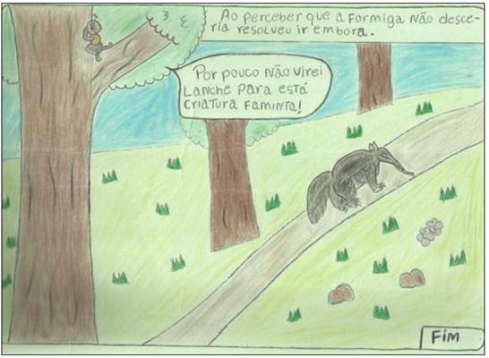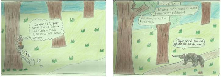 Ademais, a aluna M2 organizou os balões de acordo com a dinâmica e necessidade da sua história, o que implica dizer que o leitor precisa ler na sequência determinada pela história, para que consiga compreendê-la. No mesmo quadrinho 11, é possível observar uma onomatopeia, marcada pelo signo visual “zup”, na intenção de mostrar ao leitor um som gráfico indicando que a personagem formiga se movimenta para subir na árvore, para fugir da ação do tamanduá. É importante assinalar que um dos recursos mais caracterizados nas histórias em quadrinhos e bastante disseminados nessa linguagem são as onomatopeias. Referem-se aos sons gráficos das histórias, podendo assumir diferentes tipos, dependendo da ação desenvolvida e criatividade do autor. Podem estar presentes dentro ou fora dos balões.