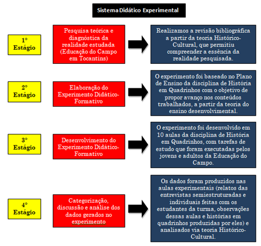 Começamos a elaborar o experimento, tendo como base o Plano da Disciplina de HQ, e nos estudos realizados de Davídov (2014; 1997; 1988; 1978), Vigotski (2010; 2009; 2007; 2001; 2000; 1999; 1998) e Aquino (2017; 2015; 2013). Com isso, desenvolvemos um experimento com tarefas e ações realizadas em cada aula experimental pelos educandos jovens e adultos camponeses do curso de Licenciatura em Educação do Campo da UFT/UFNT, a partir de leituras verbais, visuais e produções artísticas (desenhos) que totalizaram 10 (dez) aulas, ou seja, executamos o experimento em 10 (dez) aulas da disciplina de História em Quadrinhos, ao longo de um semestre. A ideia principal do Experimento Didático-Formativo é que o ensino por ele organizado aumenta a qualidade da aprendizagem e, consequentemente, do desenvolvimento pleno dos educandos (AQUINO, 2017).