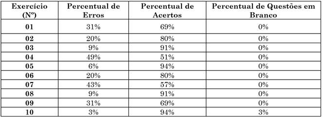 Em relação a avaliação da intervenção, acredita-se que as 26 aulas, que envolveram saídas a campo, aulas expositivo-dialogadas e uso de novas tecnologias pelos estudantes em aula, sintetizadas pelo jogo de perguntas e respostas para o aprendizado do conteúdo, foram fundamentais para o aprendizado dos estudantes. Os resultados dos testes da última aula mostraram que houve uma melhora na compreensão do tema impactos ambientais: foram aplicadas dez atividades, dentre elas, questões de múltipla escolha, com diferentes graus de complexidade (algumas oriundas de provas de vestibulares e do ENEM). Objetivou-se (com esta prática mais tradicional) ampliar a possibilidade de verificação das aprendizagens dos estudantes, para além das constatações dialógicas observadas nas aulas. Ao término, obteve-se os seguintes percentuais de erros e acertos nas atividades: