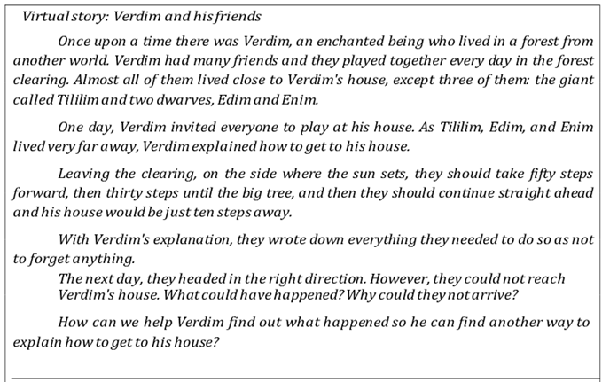 The virtual story Verdim and his friends, shown in Table 1, was originally created by a group of researchers members of Grupo de Estudos e Pesquisa sobre Atividade Pedagógica (GEPAPe) and Grupo de Estudos do Ensino e Aprendizagem de Matemática na Infância (GEEAMI), from Lanner de Moura (1995). It was presented to the teacher training group with the aim of carrying out an analysis of its potential to set the concept of length measurement into a movement of appropriation, through mediated, planned, and oriented actions to solve the problem proposed by the teacher.