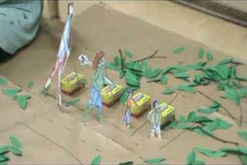 The story of Verdim and his friends. Then I told them the story (she tells at this moment that they had planned to use polystyrene foam to keep the characters in the model standing. However, it would not hold them so the teacher used gouache paint boxes to support them, as shown in Figure I).