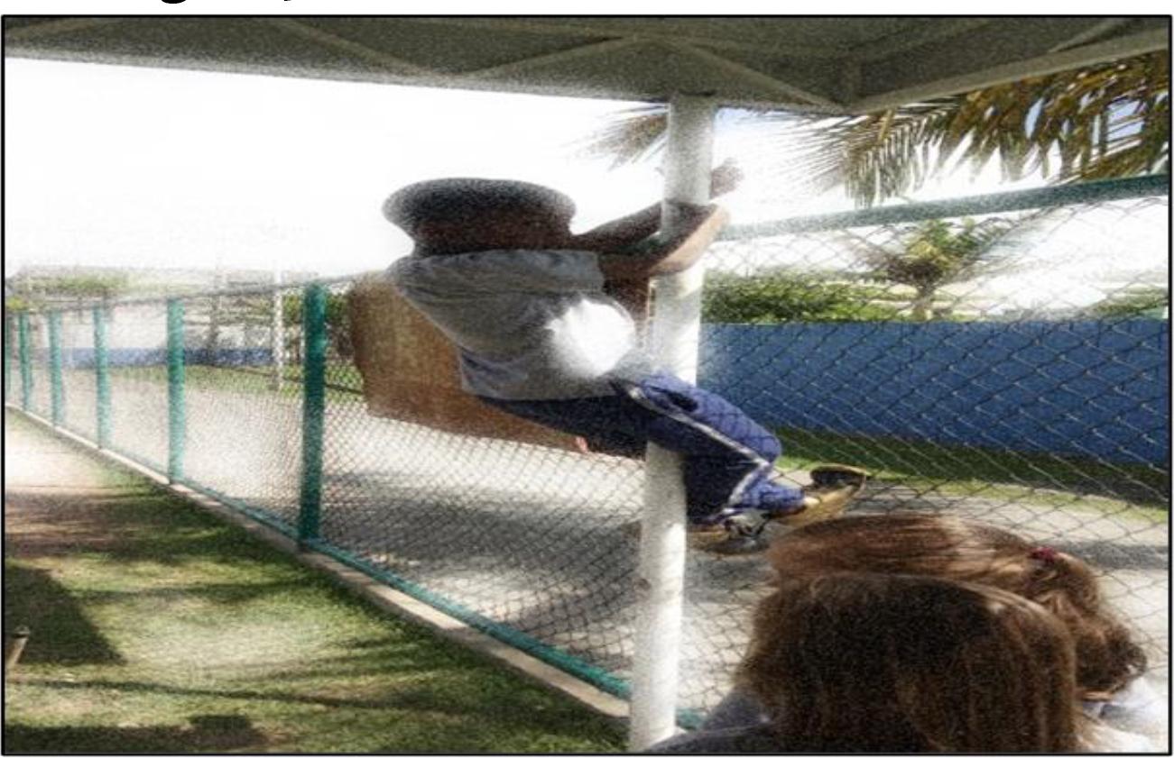 Certo dia, na aula de Educação Física, a professora Laura pediu para que a turma do Jardim II do NEI 2 fizesse uma fila e que fosse para a mini quadra, enquanto ela iria buscar o som para ensaiarem a música da apresentação de Natal. Quando as crianças perceberam que não estavam sendo ‘vigiadas’ pela professora, não fizeram a fila e saíram correndo em direção à mini quadra. Chegando lá, encontraram à sua disposição bolas e bambolês, mas, “Cristiano” não quis brincar com esses materiais, e foi em direção à barra de sustentação do toldo da mini quadra e começou a escalá-la. Nesse momento a pesquisadora lhe perguntou: