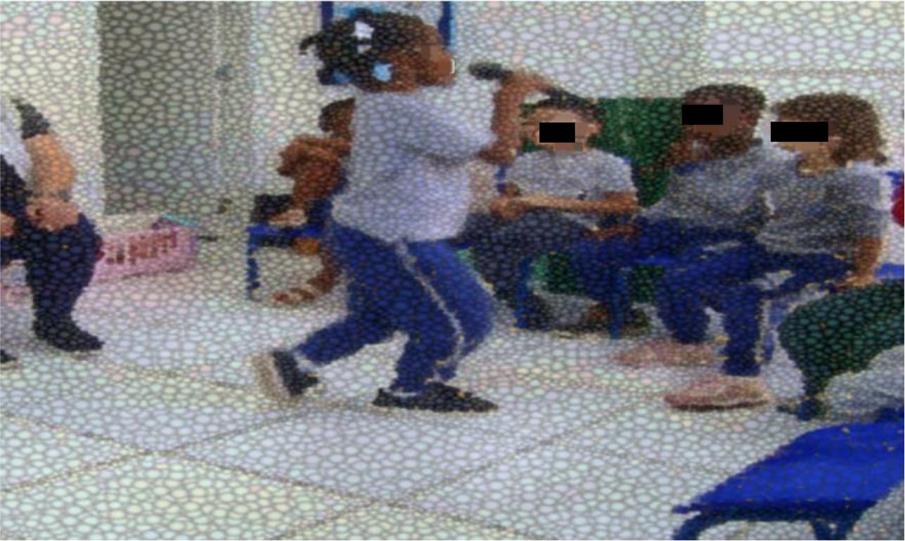 Pesquisas envolvendo crianças migrantes e negras apontam o seu isolamento e silenciamento quanto à participação nas atividades realizadas na EI (Coelho, 2005; Tanurri, 2010; Alexandre, 2019). No entanto, as crianças haitianas, nos NEIs investigados, participam das atividades tal como as brasileiras e, especialmente nas atividades em sala, pedem para cantar, contar histórias, responder às perguntas, etc. Ou seja, eram sempre as primeiras a se posicionar quando as professoras, ao iniciarem alguma atividade, perguntavam quem queria contar uma história, cantar uma música ou falar sobre o fim de semana. A foto abaixo demonstra um desses momentos, em que as crianças haitianas, assim como as brasileiras, exerciam um dos seus direitos: o da participação.